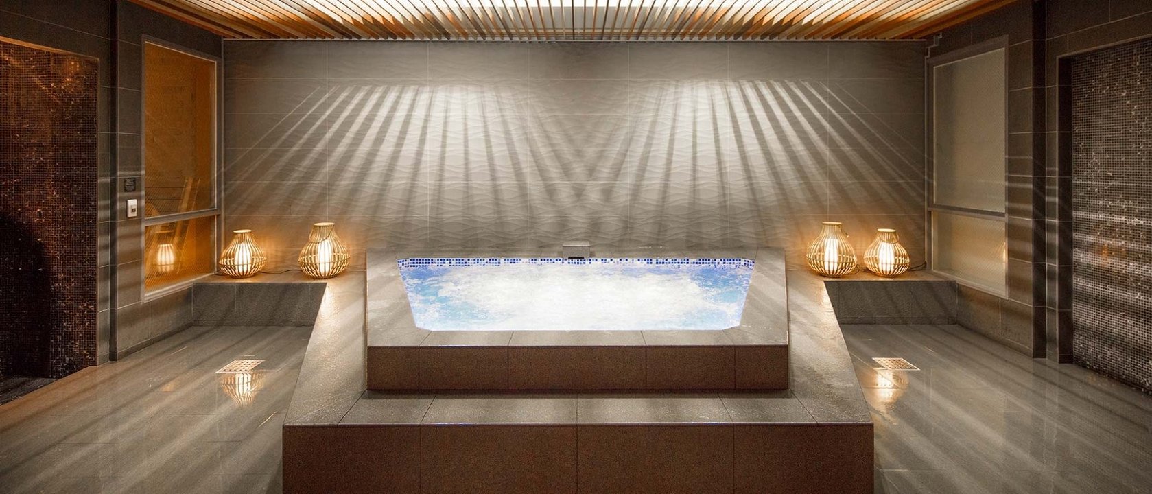 The Jacuzzi and warm room are located by the pool.