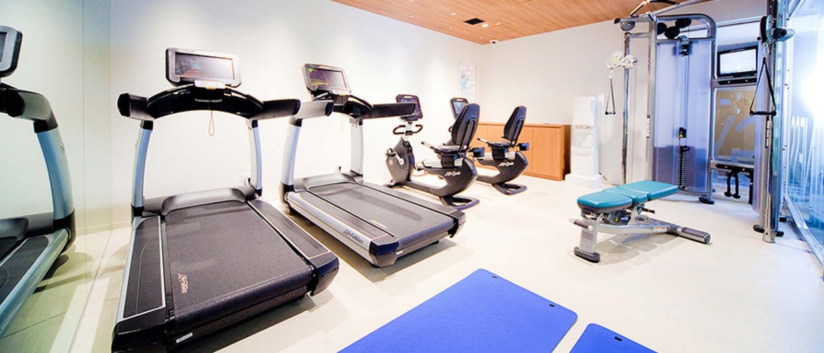 A fitness gym with exercise machines by Life Fitness, a leading brand of exercise machines.